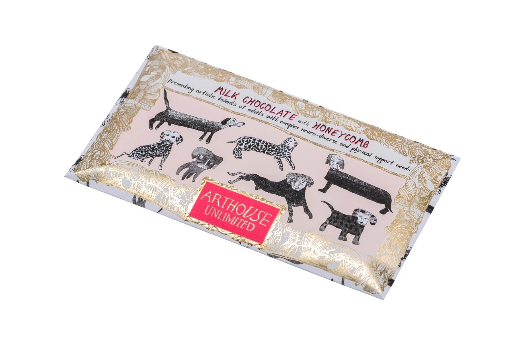 Wrapped in coloured foil and encased in a recyclable envelope, this bar features the ARTHOUSE Unlimited artists’ original 'Dogalicious' artwork presented in a dazzling gold frame. An ideal gift for chocoholics, art lovers and good-cause supporters everywhere!